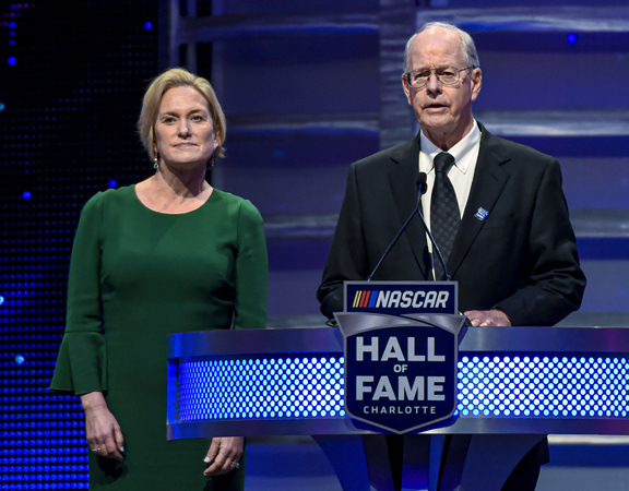 CEO and Chairman of NASCAR Jim France, right, along with the Executive Vice President of NASCAR Lesa France Kennedy announce the Landmark Award to Edsel Ford II at Hall of Fame induction ceremonies in Charlotte, N.C., on Jan. 31, 2020. NASCAR teams recently boycotted a meeting with series leadership Wednesday as a show of frustration over the slow pace of negotiations on a new business model. Moving forward, they want NASCAR chairman Jim France and executive vice chair Lesa France Kennedy at the meetings, the team representatives told AP. (AP file photo)