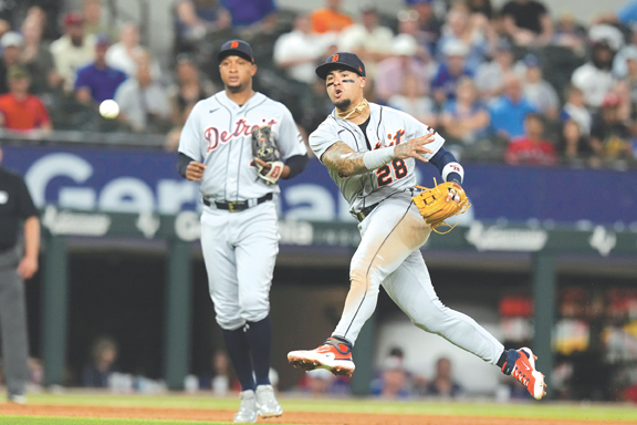 Detroit Tigers shortstop Javier Baez throws to first base against the Texas Rangers in Arlington, Texas, on Tuesday. (AP photo)
