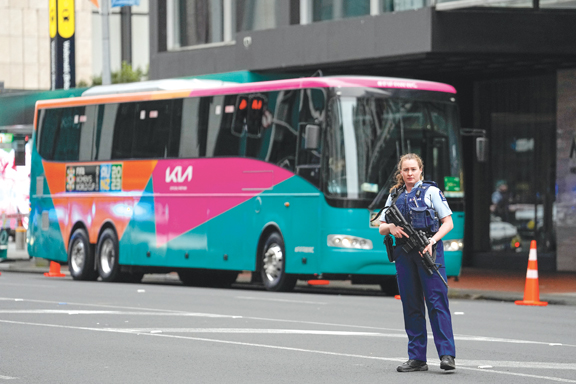 An armed New Zealand police officer stands outside a hotel housing a team from the FIFA Women's World Cup in the central business district following a shooting in Auckland, New Zealand, today. New Zealand police are responding to reports that a gunman has fired shots in a building in downtown Auckland. (AP photo)