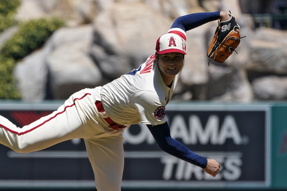 The Los Angeles Angels’ Shohei Ohtani pitches in the first inning against the Cincinnati Reds on Wednesday in Anaheim, Calif. (AP photo)