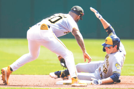 - The Milwaukee Brewers’ Christian Yelich, right, slides safely into second with a double ahead of the tag by Pirates second baseman Liover Peguero during the first inning in Pittsburgh on Wednesday. (AP photo)