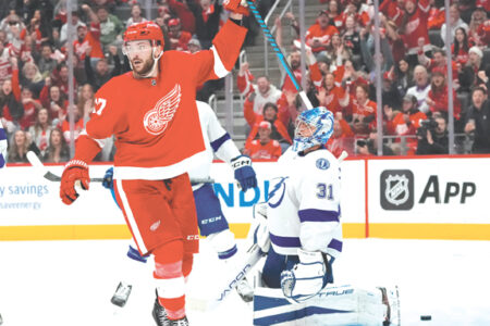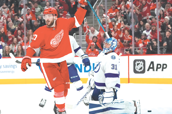 - Red Wings center Michael Rasmussen celerates a teammate’s goal on Tampa Bay Lightning goaltender Jonas Johansson, right, during the second period Saturday in Detroit. (AP photo)