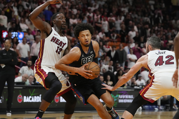 - Detroit Pistons guard Cade Cunningham drives to the basket as Miami Heat center Bam Adebayo (13) and forward Kevin Love (42) defend during the second half Wednesday in Miami. (AP photo)