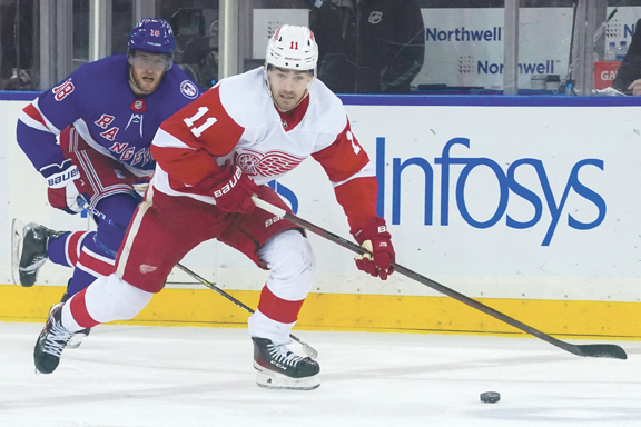 - Detroit Red Wings right wing Filip Zadina, right, goes on a breakaway from New York Rangers center Andrew Copp during second period on April 16, 2022, in New York. (AP file photo)