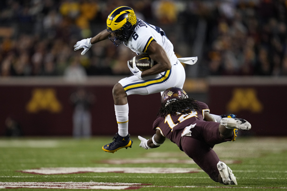 Michigan wide receiver Cornelius Johnson, top, runs with the football as Minnesota defensive back Darius Green attempts a tackle during the first half Saturday in Minneapolis. (AP photo)