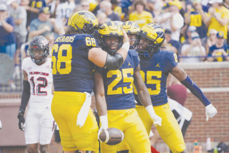 - Michigan running back Hassan Haskins, center, celebrates his 5-yard touchdown run in the first half in Ann Arbor on Sept. 18, 2021. (AP file photo)