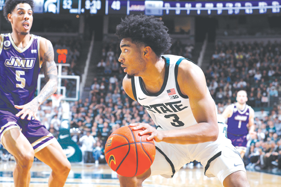 Michigan State's Jaden Akins, right, drives against James Madison's Terrence Edwards Jr. on Monday in East Lansing. (AP photo)