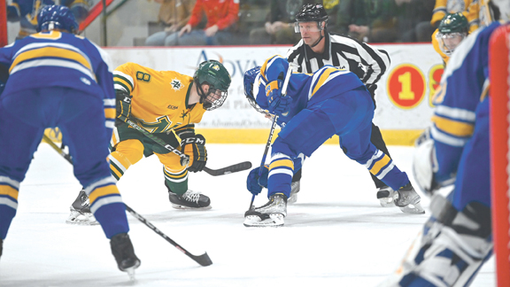 Northern Michigan University’s Artem Shlaine, left, takes a faceoff against a Lake Superior State player during a CCHA game played last season at the Berry Events Center in Marquette. (Photo courtesy NMU)