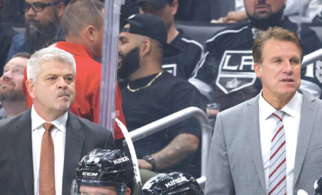 - Los Angeles Kings head coach Todd McLellan, left, and assistant coach Jim Hiller watch from the bench during a recent Los Angeles Kings home game. (Photo courtesy L.A. Kings Insider website)