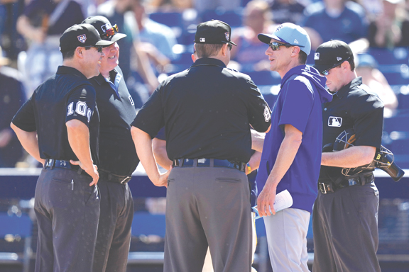 - Chicago Cubs manager Craig Counsell, second from right, talks with umpires, from left, David Arrieta, Bill Miller, Doug Eddings and Tyler Jones, before a spring training game against the Milwaukee Brewers on Wednesday in Phoenix. (AP photo)