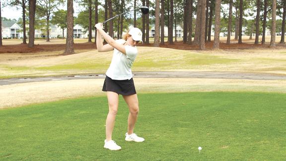 Northern Michigan University junior women’s golfer Maya Hunter tees off during the GLIAC Championships held at Stonehedge Golf Club in downstate Augusta on Friday. She had the Wildcats’ lowest score of 77 and is only four strokes behind the leader with this morning’s final stroke play round that will determine the individual medalist. (Photo courtesy NMU)