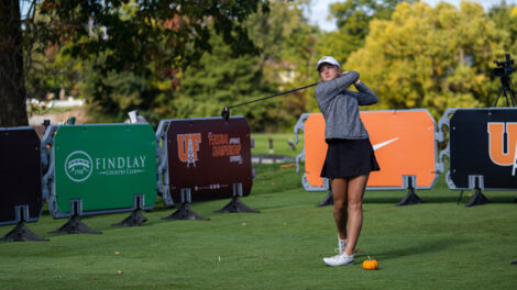 Northern Michigan University women’s golfer Maya Hunter tees off during a tournament held at Findlay, Ohio, University during the 2022-23 season. (Photo courtesy NMU)