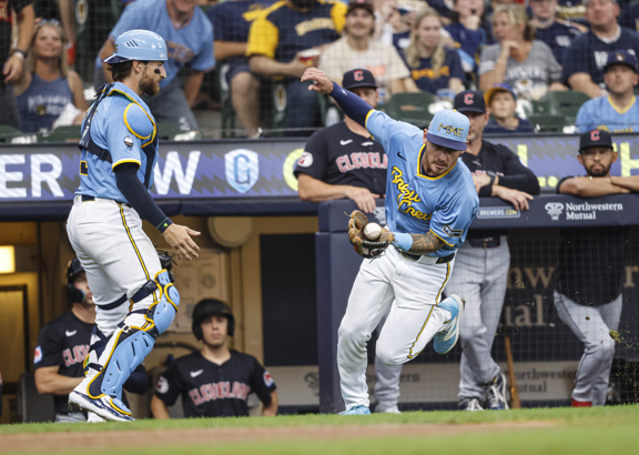 The Brewers' Joey Ortiz, front right, catches a foul ball hit by the Cleveland Guardians' Josh Naylor during the third inning on Sunday in Milwaukee. (AP photo)