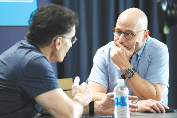 New York Yankees general manager Brian Cashman, right, speaks to a reporter during a spring training media day on Feb. 15 in Tampa, Fla. (AP file photo)
