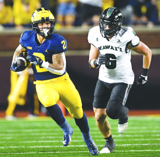 Michigan Wolverines running back Blake Corum, left, rushes as he is chased by Hawaii defensive back Riley Wilson during the first half on Sept. 10, 2022, in Ann Arbor. (AP file photo)