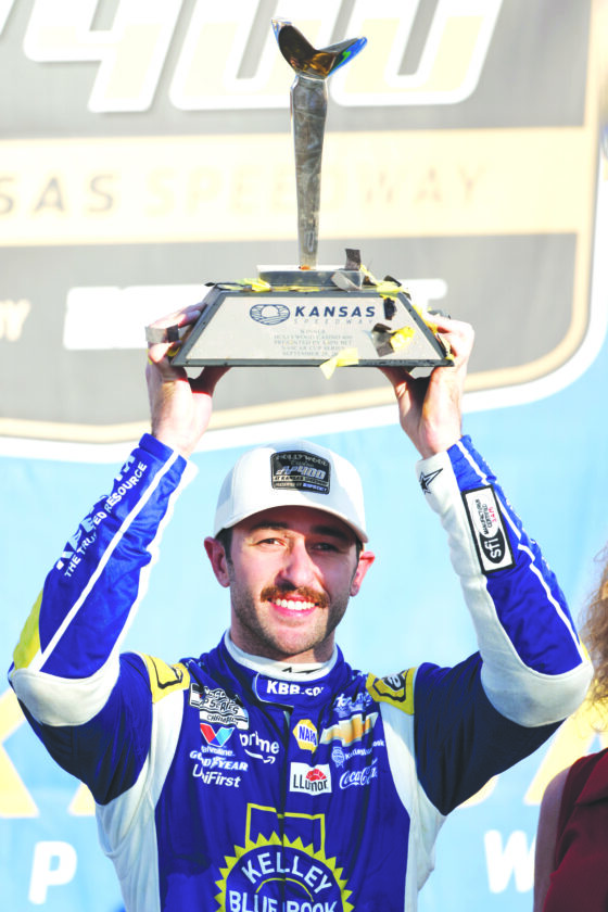 Chase Elliott celebrates after winning a NASCAR Cup Series race at Kansas Speedway in Kansas City, Kan., on Sunday. (AP photo)