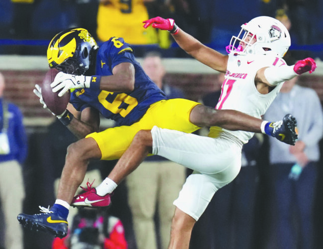 Michigan defensive back Brandyn Hillman, left, intercepts a pass intended for New Mexico wide receiver Michael Buckley during the second half on Saturday in Ann Arbor. (AP photo)