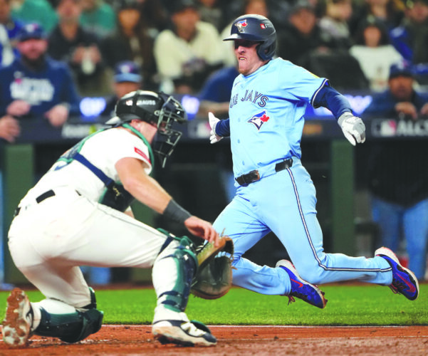 The Toronto Blue Jays' Myles Straw, right, scores on a base hit by Andrés Giménez as Mariners catcher Cal Raleigh waits for the throw during the eighth inning in Game 4 of the American League Championship Series on Thursday in Seattle. (AP photo)