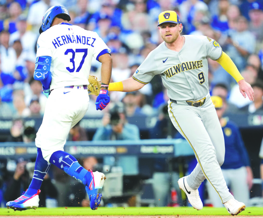 Dodgers right fielder Teoscar Hernández, left, is tagged out by Milwaukee Brewers first baseman Jake Bauers during Game 4 of the National League Championship Series on Friday in Los Angeles. (AP photo)