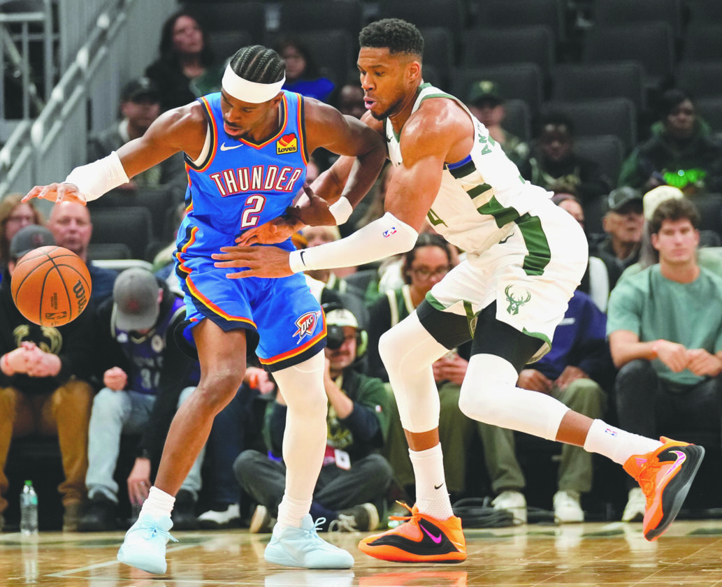 Oklahoma City Thunder guard Shai Gilgeous-Alexander, left, dribbles the ball against Bucks forward Giannis Antetokounmpo during the first half of their NBA preseason game on Tuesday in Milwaukee. (AP photo)