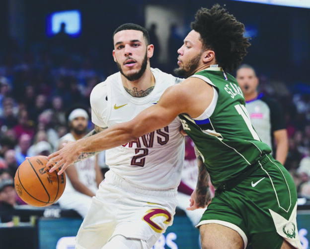 Cavaliers guard Lonzo Ball, left, drives against Milwaukee Bucks guard Mark Sears in the first half on Sunday in Cleveland. (AP photo)