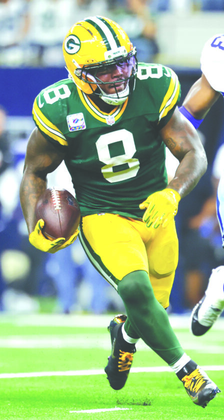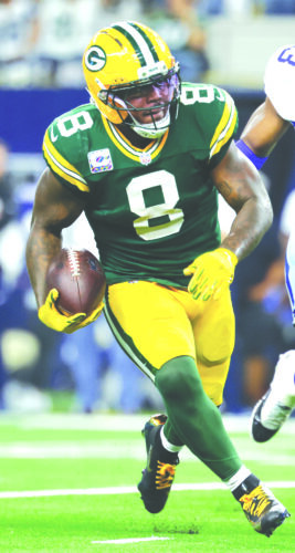 Green Bay Packers running back Josh Jacobs carries the ball against the Dallas Cowboys on Sept. 28 in Arlington, Texas. (AP photo)
