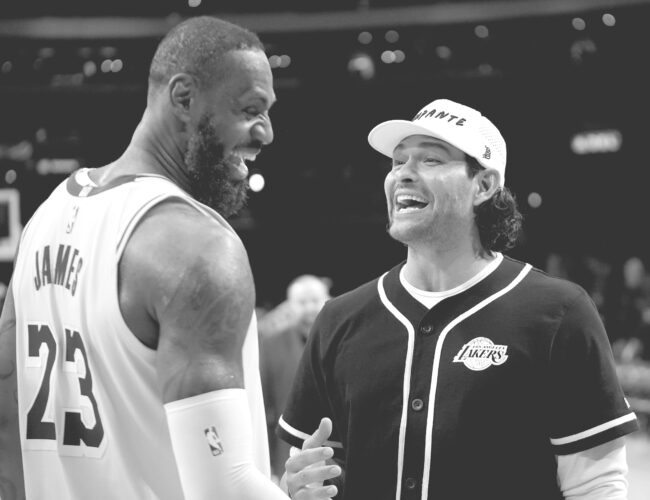 Los Angeles Lakers forward LeBron James, left, talks with former NFL quarterback Mark Sanchez after an NBA game against the Chicago Bulls on Jan. 25, 2024, in Los Angeles. (AP file photo)