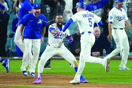 - Los Angeles Dodgers’ Teoscar Hernández throws water on Freddie Freeman (5) after Freeman hit a walk off home run during the 18th inning in Game 3 of baseball’s World Series against the Toronto Blue Jays on Monday in Los Angeles. (AP photo)