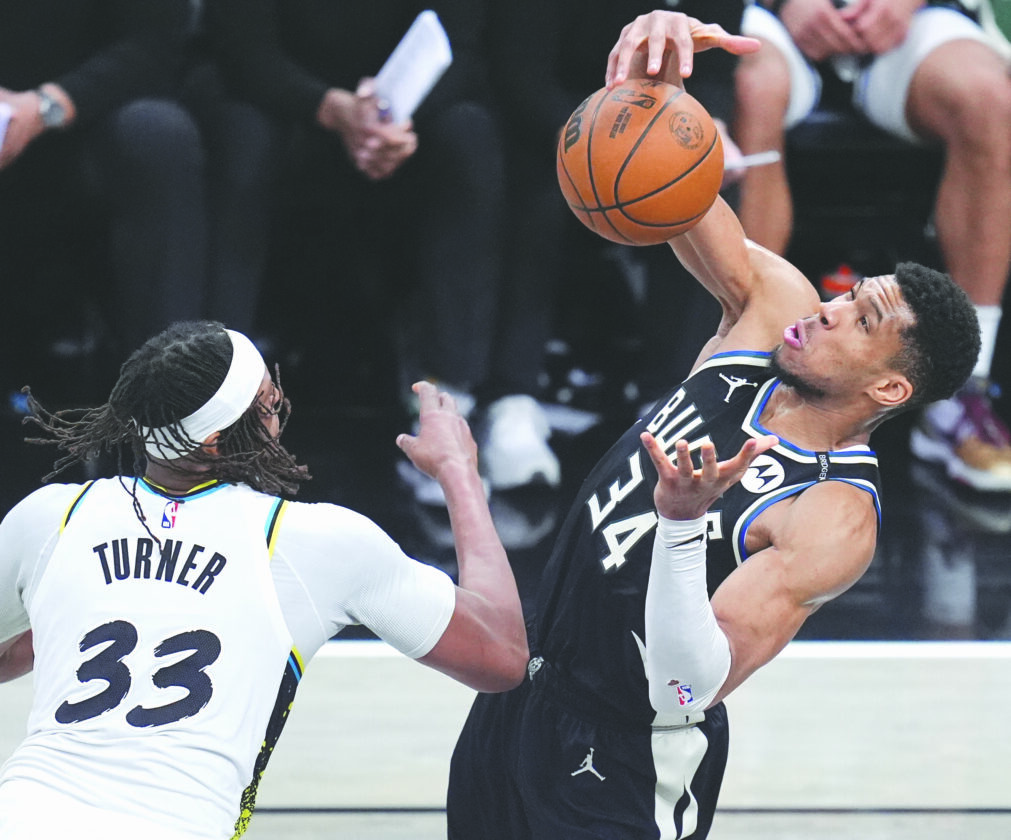 Milwaukee Bucks forward Giannis Antetokounmpo, right, grabs the ball around Indiana Pacers center Myles Turner during the second half in Game 5 of an NBA first-round playoff series in Indianapolis on April 29. (AP file photo)