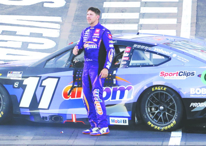 Denny Hamlin stands by his car after winning a NASCAR Cup Series race on Sunday in Las Vegas. (AP photo)