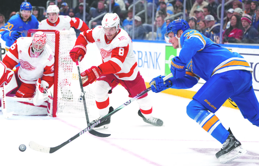 Ben Chiarot and Elmer Soderblom also scored, and John Gibson made 20 saves for the Red Wings, who had rallied from a four-goal deficit to beat the Blues 6-4 on Saturday night.