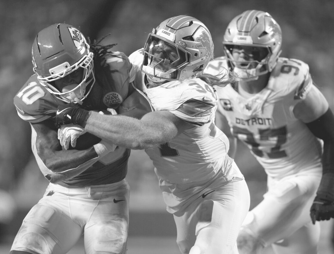 Detroit Lions middle linebacker Alex Anzalone, center, tackles Chiefs running back Isiah Pacheco, left, on Sunday in Kansas City, Mo. (AP photo)