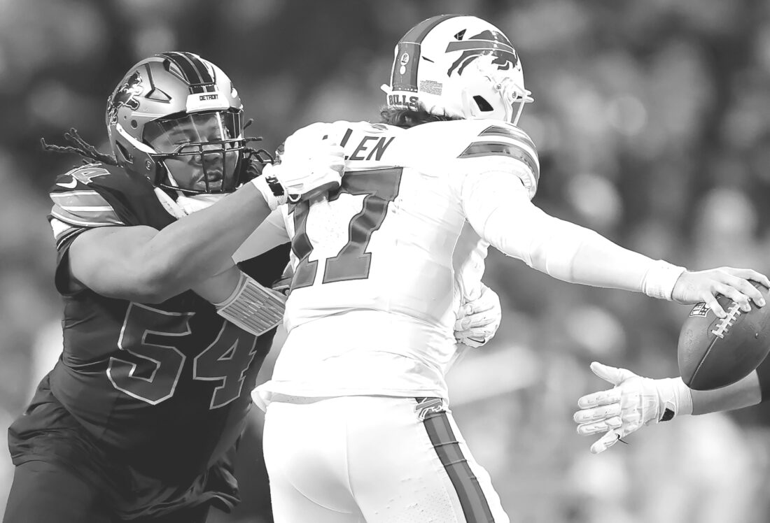 Buffalo Bills quarterback Josh Allen, right, is pressured by Lions defensive tackle Alim McNeill during the first half on Dec. 15 in Detroit. (AP file photo)