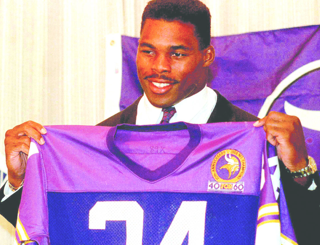 Former Dallas Cowboys running back Herschel Walker holds up his new jersey as he is introduced at a news conference to announce the trade of five players and seven draft choices by the Minnesota Vikings for the leading NFC rusher on Oct. 13, 1989, in Bloomington, Minn. (AP file photo)