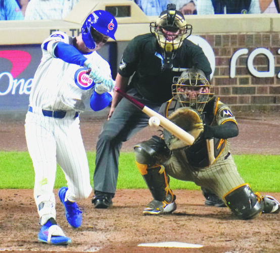 The Cubs' Pete Crow-Armstrong hits a single in the eighth inning of Game 3 of a National League wild card game against the San Diego Padres on Thursday in Chicago. (AP photo)