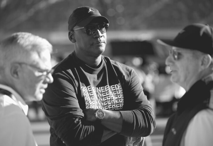 Michael Jordan, center, and Curtis Polk, left, co-owners of 23XI Racing, watch during qualifying beside 23XI Racing President Steve Lauletta, right, for a NASCAR Cup Series race on Nov. 9, 2024, in Avondale, Ariz. (AP file photo)