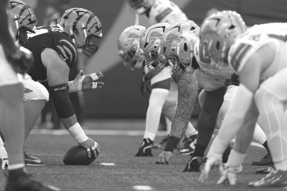 The Detroit Lions' defense, right, lines up against the Bengals as they ready to run a play on Sunday in Cincinnati. (AP photo)