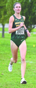 Northern Michigan University’s Madi Szymanski leads the way in the collegiate part of the Wildcat Open cross country meet held on campus in Marquette on Aug. 22. (Photo courtesy of Cara Kamps)