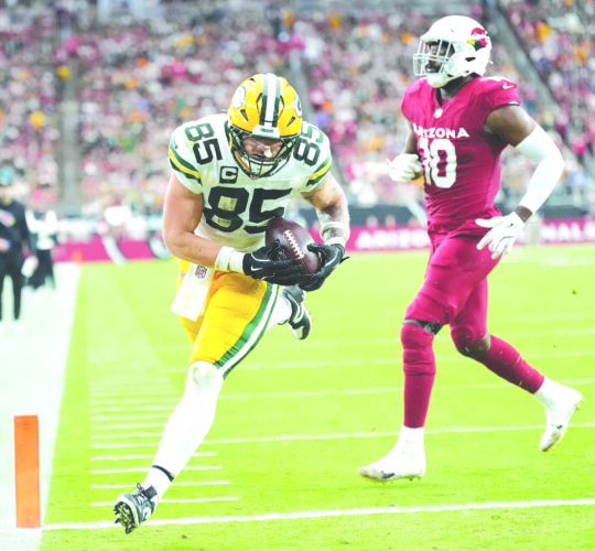 The Green Bay Packers' Tucker Kraft catches a touchdown pass during the second half against the Arizona Cardinals on Sunday in Glendale, Ariz. (AP photo)