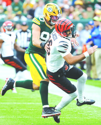 Packers defensive end Lukas van Ness, left, hits the Cincinnati Bengals' Joe Flacco in the first half on Sunday in Green Bay, Wis. (AP photo)
