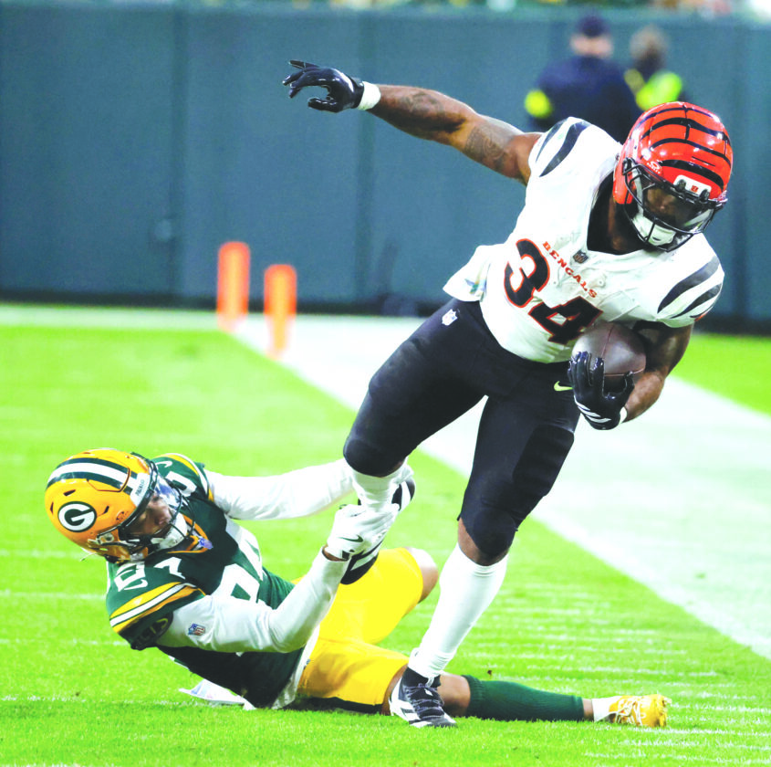 Cincinnati Bengals running back Samaje Perine, right, tries to get away from Packers cornerback Carrington Valentine on Sunday in Green Bay, Wis. (AP photo)