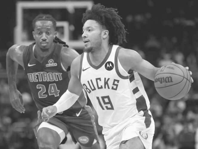 The Bucks' Mark Sears, right, gets past the Detroit Pistons' Daniss Jenkins during the second half of an NBA preseason game last Thursday in Milwaukee. (AP photo)