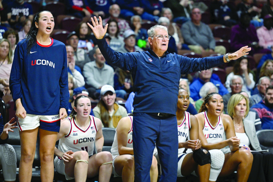 UConn head coach Geno Auriemma gestures as player Caroline Ducharme, left, calls out to their team in the first half of an exhibition NCAA college basketball game against Boston College on Oct. 13 in Uncasville, Conn. (AP photo)