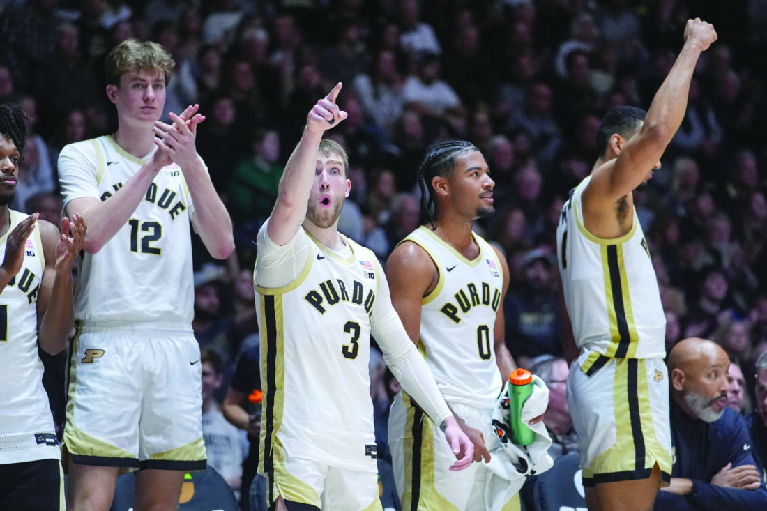 Purdue players, left, to right, Daniel Jacobsen, Braden Smith, C.J. Cox, and Trey Kaufman-Renn celebrate on the bench during the second half of an NCAA college basketball game against Akron in West Lafayette, Ind., on Nov. 16. (AP photo)