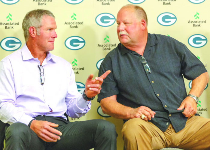 Former Packers quarterback Brett Favre, left, jokes with former head coach Mike Holmgren at a news conference prior to Favre's induction into the Packers Hall of Fame and having his No. 4 jersey retired in July 2015 at Lambeau Field in Green Bay, Wis. (AP file photo)