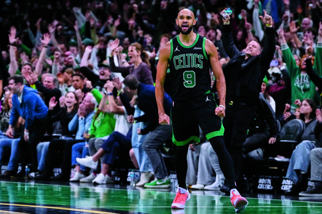 Boston Celtics guard Derrick White (9) celebrates after hitting a there-pointer late in the second half of an Emirates NBA Cup basketball game against the Detroit Pistons on Wednesday in Boston. (AP photo)
