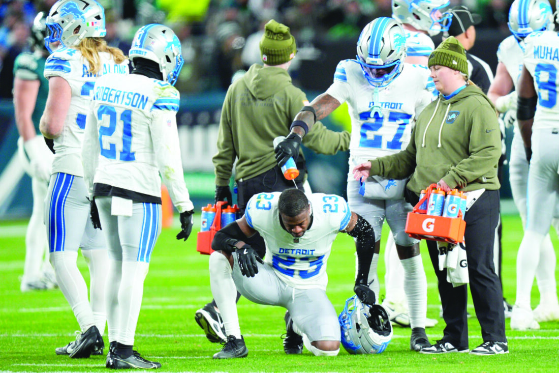 Detroit Lions cornerback Arthur Maulet (27) pours water on Lions cornerback Rock Ya-Sin (23) during the second half of an NFL football game against the Philadelphia Eagles on Sunday in Philadelphia. (AP photo)