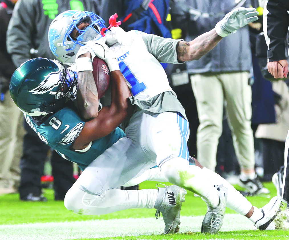Eagles cornerback Adoree' Jackson, left, lays a hard hit on Detroit Lions wide receiver Jameson Williams on Sunday in Philadelphia. (AP photo)