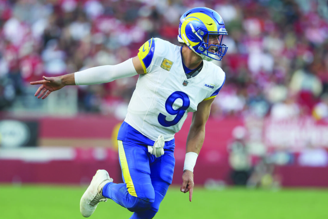 Los Angeles Rams quarterback Matthew Stafford (9) celebrates after throwing a touchdown pass to tight end Colby Parkinson during the second half of an NFL football game against the San Francisco 49ers in Santa Clara, Calif., Sunday. (AP photo)