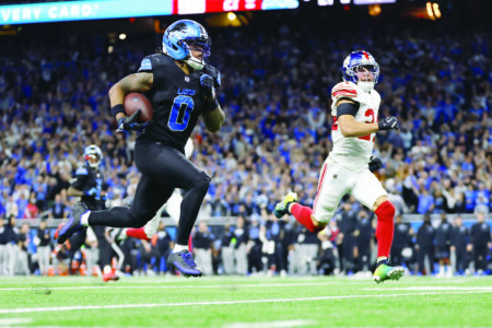 Detroit Lions running back Jahmyr Gibbs (0) runs past New York Giants safety Dane Belton (24) for a touchdown in overtime of an NFL football game in Detroit on Sunday. (AP photo)